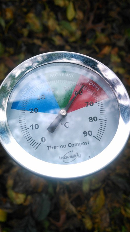 In October, the thermometer shows the thermophilic reactions going on in the compost pile.