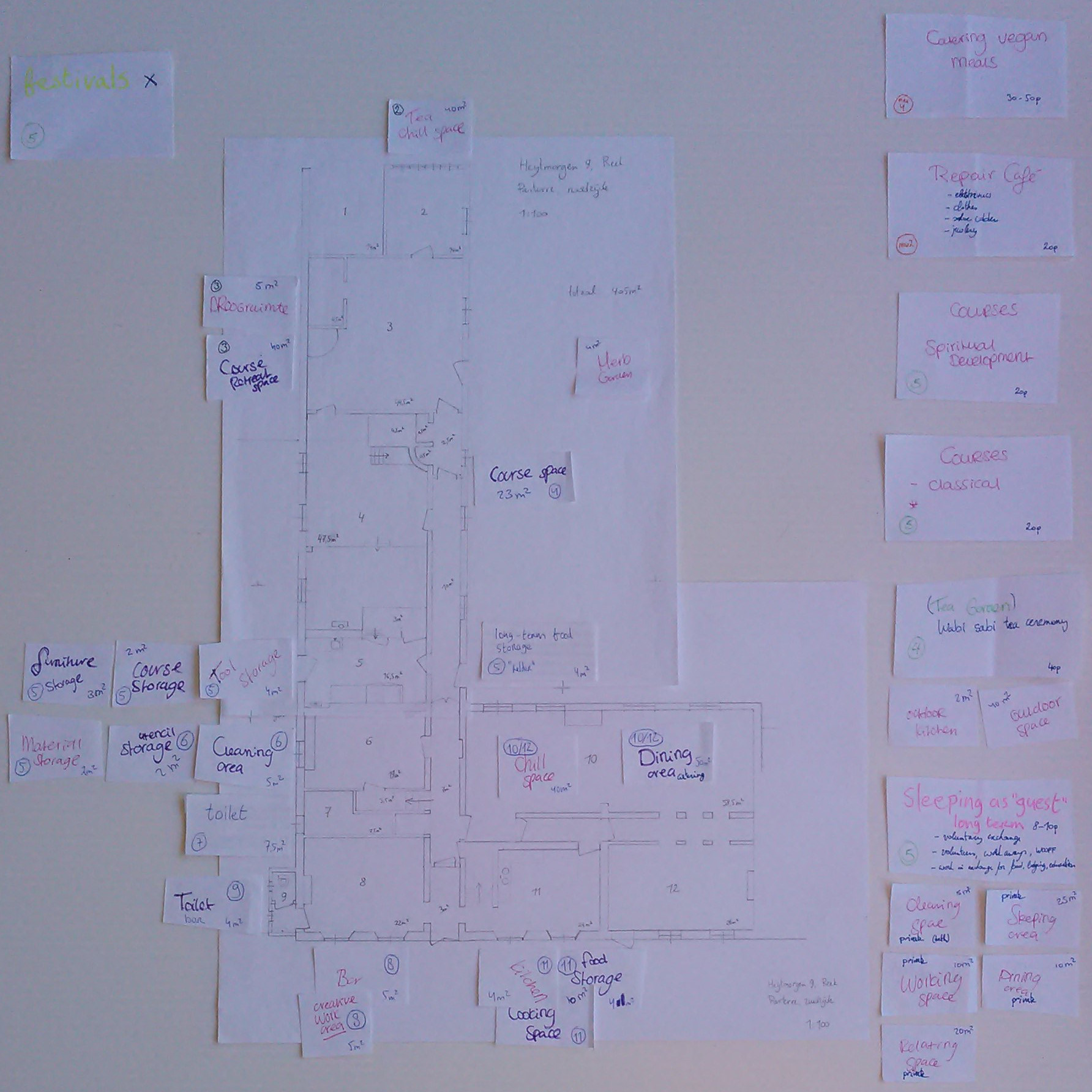 We focussed our design on the ground floor of the monastery building. Since the house has a first (and second) floor, we decided to reserve this space for the private living space of long term guests. This eliminated some needs from consideration. Needs that are related to activities and structures in the garden were also out of scope.