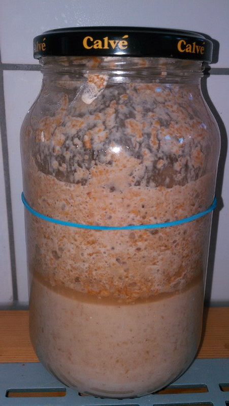 For a friend I created a second sourdough started. I took 200g from my starter and added the usual 100g of whole meal flower and 100g of water. The rubber band indicates maximum filling capacity to avoid the container overflowing as the started will double in size in a few days even when living in the refrigerator.